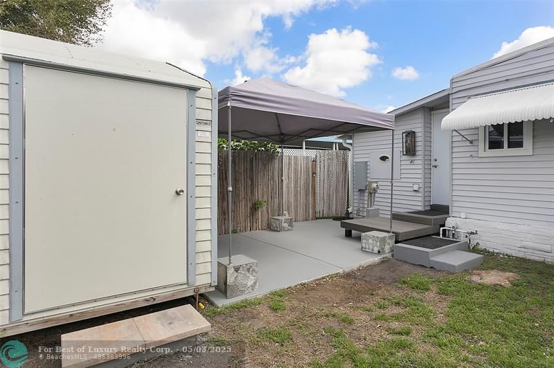 - Exterior Features: Shed, Storm/ Security Shutters