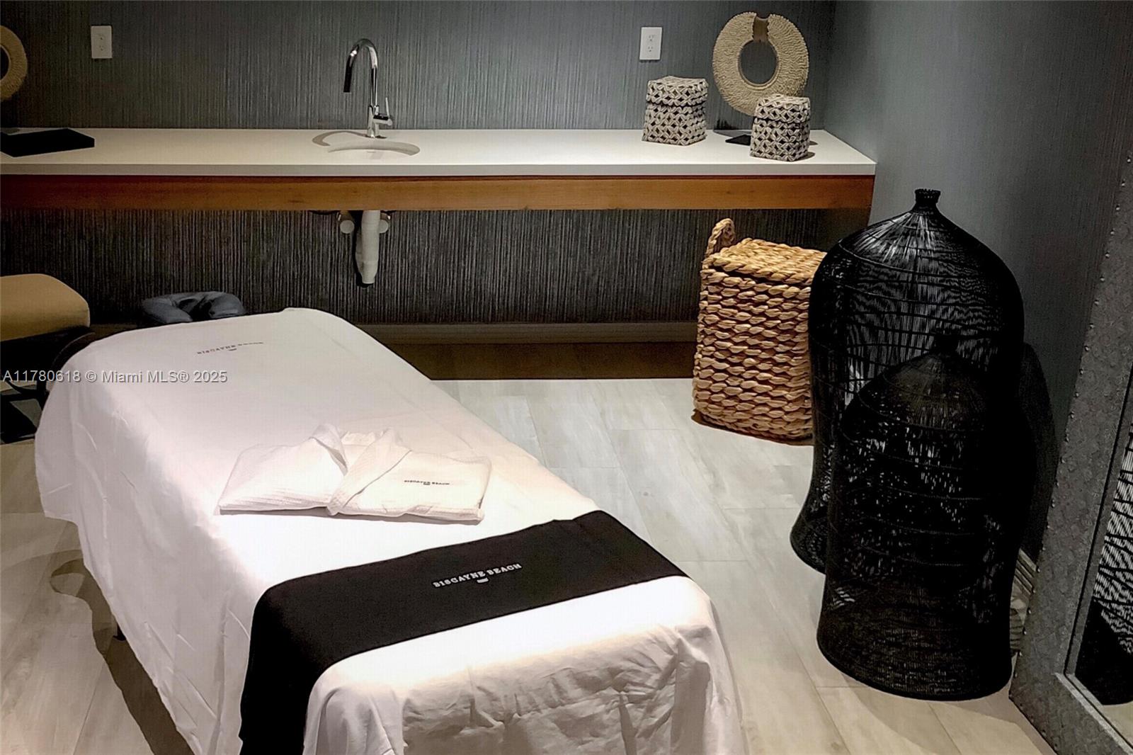 This stunning 2-bedroom, 3-bathroom condo with a den features luxury upgrades like a UV light system, 3M water filter, and Roberto Cavalli wallpaper. The master suite offers a custom closet, full-wall mirror, updated shower with new handles, and sleek floating vanities. Italian porcelain floors, a black kitchen island, and electric blackout shades add to the elegance. Designed by Thom Filicia, the condo includes private elevator access, top-tier appliances, and bay views. Amenities feature two pools, beach club, gym, spa, tennis courts, dog park, and 24-hour concierge. Spot #664 parking included. Located 10 minutes from the Design District, Midtown, and the American Airlines Arena, enjoy exclusive Miami events like sunset cruises and beachfront yoga.